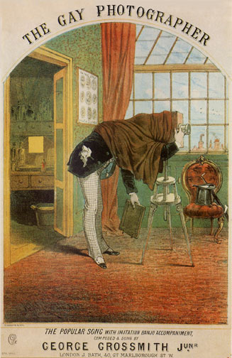 Sheet Music with Photographic Themes Popular music has always reflected popular culture so it is no surprise that sheet music can be found with photographic themes. Five examples from our collection are shown here. We also have others including The Snap Shot Man, I Wish I Had a Photograph of That, and The New Photographee. We will add more examples as time goes on. Our cousin, a talented musician, has recorded some of the songs for us. If we can master the logistic of posting sound files we will add some of them to the site. On the right is The Gay Photographer (which we take to mean carefree) is an 1870 English "comic" song by George Grossmith Jr. about a photographer. He broke the heart of a young lady named Miss Jenkins so she drank his chemicals and died. Not a very amusing plot! The cover art is especially interesting because it shows the studio with camera and skylight and the interior of the darkroom. |