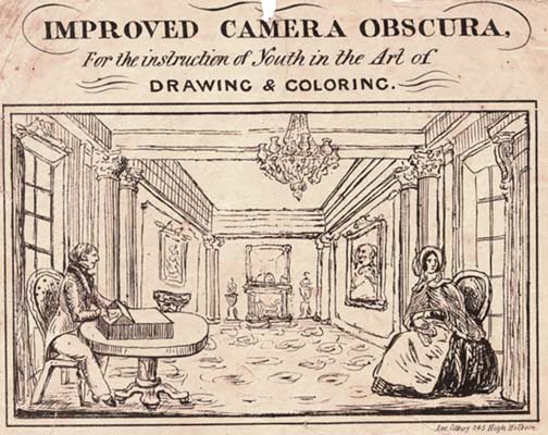 On the left is a portion of a flyer advertising the "Improved Camera Obscura, For the instruction of Youth in the Art of Drawing & Coloring." The illustration shows a young man with a box camera obscura on a table drawing a woman sitting in a chair. The flyer appears to date from near 1819/1820. London Magazine from 1819 is quoted and it does not mention that Benjamin West, who died in 1820, is deceased. As often happens in our camera obscura research, the reference to Benjamin West led us to stories about his discovery of a naturally occurring camera obscura as a child. |