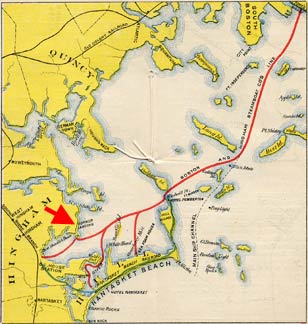 Every time we found a reference to a camera obscura in a park setting we looked for pictures and descriptions of the area. Repeated mentions of a camera obscura at Melville Garden in the 1880s began to sound intriguingly possible. Advertising cards and steamship timetables from the period mention it often but never showed a picture or gave a detailed description. Several times on eBay we found steamship timetables or trade cards that included ariel views of the park. The pictures were too small to be of assistance but we bid on them with the hope of some clues. Steamship collectors are rabid bidders! We were not bidding enough and lost several. We saw an eBay listing for a group of stereo cards that included one of Melville Garden. The style of the building pictured looked similar to the open pavilion in the lower left of the more distant view of the back of the camera obscura. Again we lost the bid since it was the only card we wanted. We won a small memorandum booklet that had a paragraph on the camera obscura but no helpful pictures. A beautiful little steamship and railroad timetable was listed with an black and white illustration of the park grounds. We finally took a deep breath and bid more than we ever had. We Won! When it arrived it was a really beautiful item but the view of the park was so small that we were sure we would not be able to see anything helpful. A high resolution, enlarged scan was made and studied. EUREKA! There it is! The open pavilion with a flag pole, the camera obscura with the lens assembly on top, and the large building with the barn shaped roof on the other side in the correct relationship to each other. Below is a close up of the stereo card and below it (flipped because it is taken from the other side) is an enlargement of the illustration from the timetable. On the right below is a map showing the route from Boston to Downer Landing. |