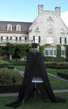 | The first showing of our Magic Mirror of Life tent was at PhotoHistory XI Symposium in Rochester, New York on October 21, 2000. A page on this site, Magic Mirror of Life at George Eastman House, is devoted to that day. When the program for PhotoHistory XII was planned for September, 2003 we were honored to be asked to bring our camera obscura tent back for a return visit. As the time neared to pack the tent and leave for Rochester we watched with mounting panic as hurricane Isabel aimed at the east coast. The closer our travel day approached the more certain it seemed that Isabel would arrive in Baltimore just in time for our trip. An alternate plan was needed since packing a large car-top carrier with equipment in the midst of a hurricane was not possible. We downsized our plans to our one-person tent, a viewing cabinet camera obscura, and a reflex box camera obscura. The night before we left we designed and printed a group of 16X20 inch posters on the camera obscura. Although the waterfront areas of Baltimore were very badly flooded in the storm, we were far enough inland to suffer only a few broken tree limbs so were able to leave on Friday, September 19. The weather was awful for the entire trip from Baltimore to Rochester but Saturday when the conference opened was clear and sunny. We set up in the beautiful side garden with a view of Eastman House.