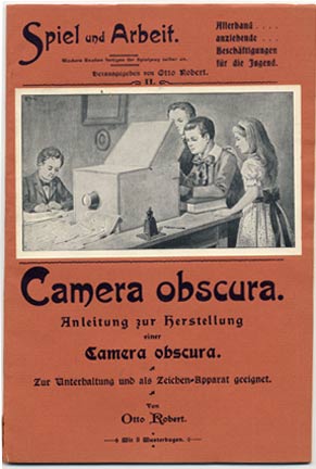 *Note: We have received a partial translation of the Play and Work booklet and will post the a notice when the PDF of the translation is available. On the right is a cardboard folder that contains a set of plans and instructions published in Germany that date from the early years of the 20th century. It is called Spiel und Arbeit which translates Play and Work. We have found references to other projects in the series that are dated 1911 and 1912. These dates seem right for our publication. The folder with a color cover contains two folded sheets of thin paper that open up to 32 X 40 inches. They contain full-size plans to build the camera pictured on the cover. A booklet with the same illustration gives instructions for completing the project, some information on different types of camera obscuras, and advertisement for other projects in the series. We know no German and can only translate a few words at a time with on-line translation programs. A kind volunteer is in the process of translating it into English. We have had the plans duplicated. Watching the flimsy paper, almost a century old, run through the copy machine made us very nervous. Fortunately, as the operator assured us, it came out perfectly and the full-size plans are wonderfully sharp and clear. As soon as we are able we will post PDF files for the text and plans. When they are ready a notice will be added here and on the front page. The first image below is a corner of the folded plans and below that is a detail showing the finished camera. We know from the partial translation that the the material used is cardboard. |